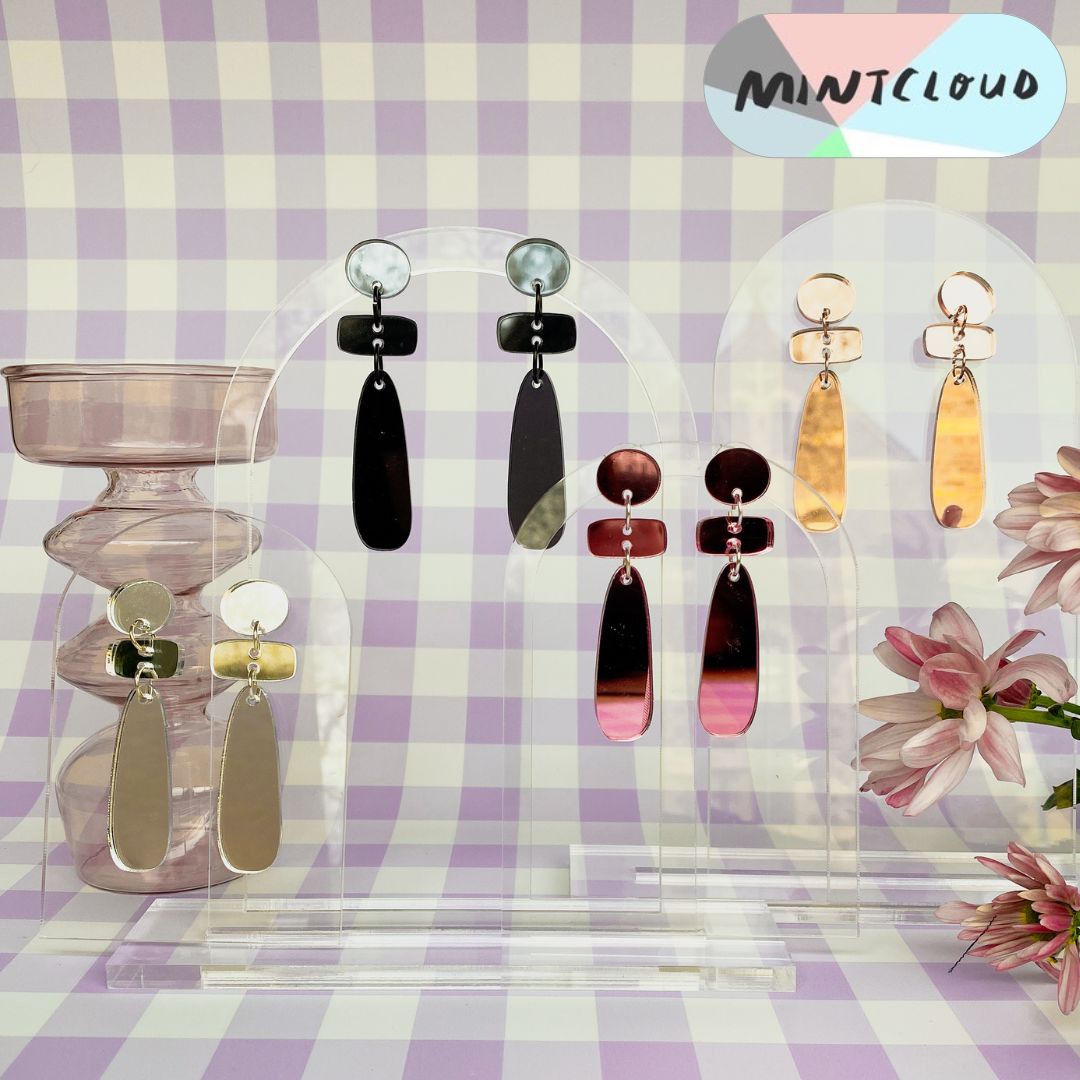 These Shapes Mirror Dangles are contemporary earrings with bold and edgy colours made of mirror acrylic. Add a pop of colour to your look with these lightweight and durable earrings that will stand out from the rest!