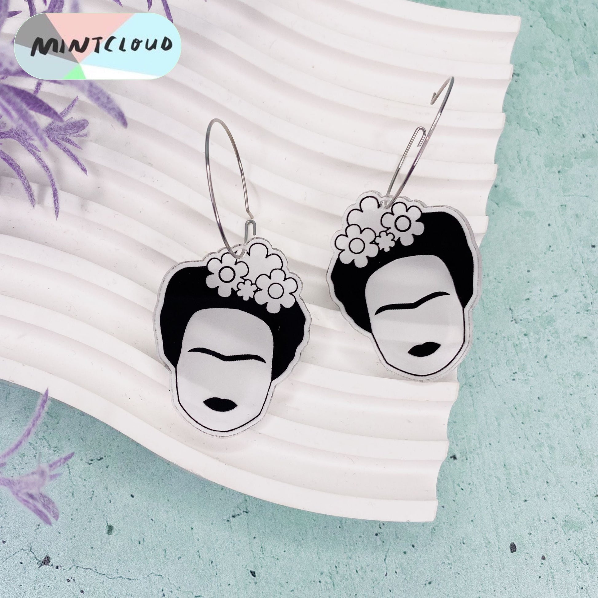 Make a stylish statement with these unique dangles, featuring Frida Khalo shaped earrings in versatile clear acrylic. Enjoy an iconic look while making a statement in lightweight, hand-crafted materials – perfect to pair with any outfit.