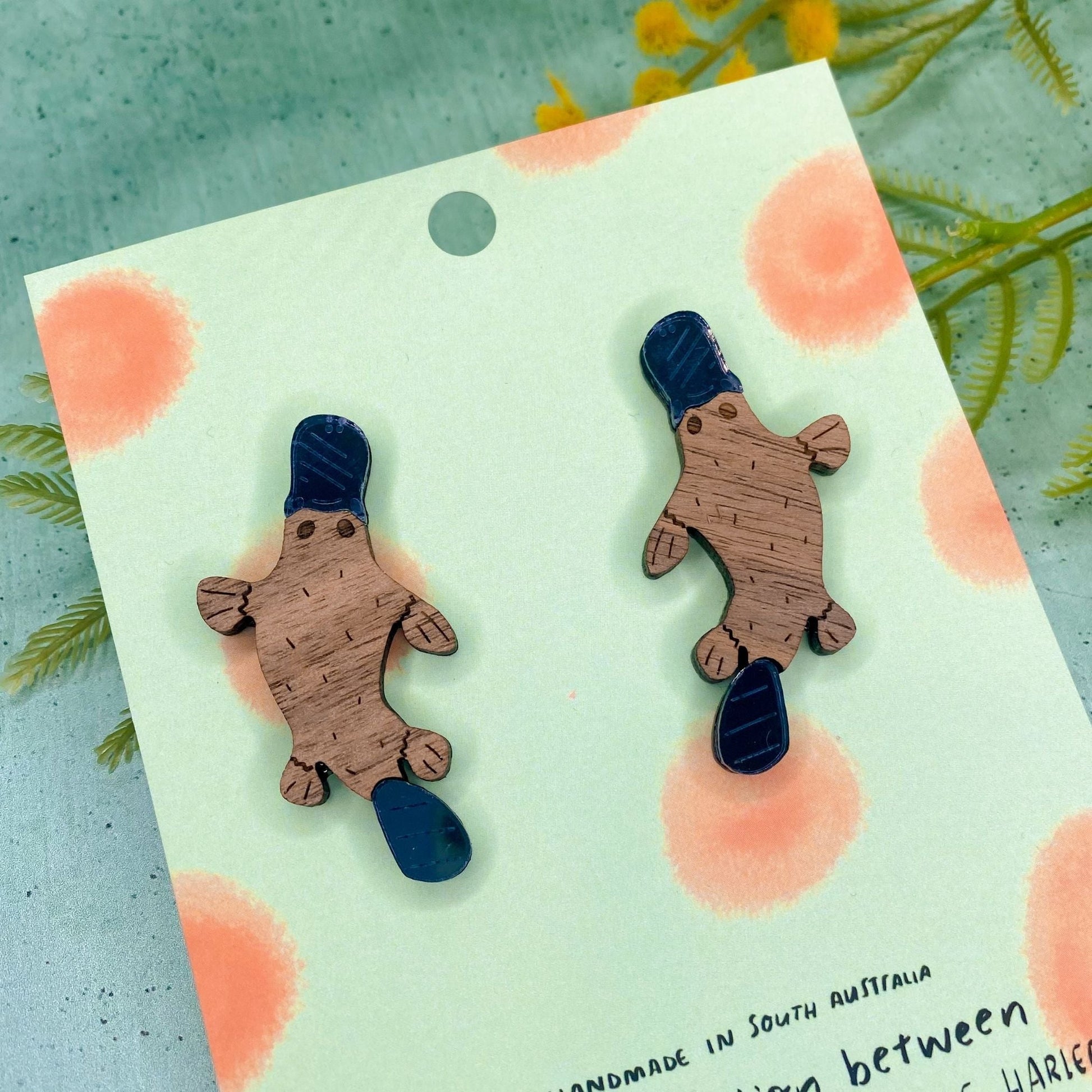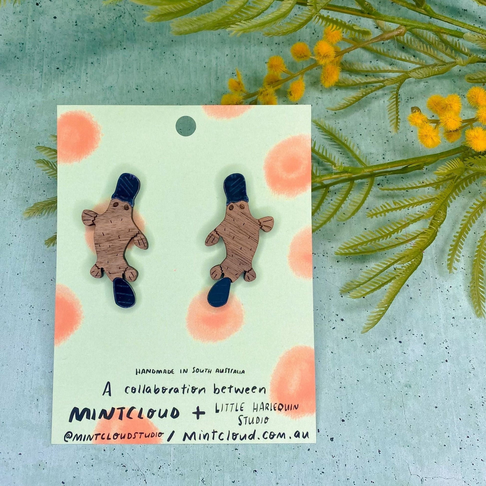 A collaboration between two South Australian artists Mintcloud and Little Harlequin Studio celebrating iconic Australian flora and fauna. Fun and quirky. Lasercut in these lovely bright colours these shine at every angle, these pieces will compliment your lobes and your outfit.