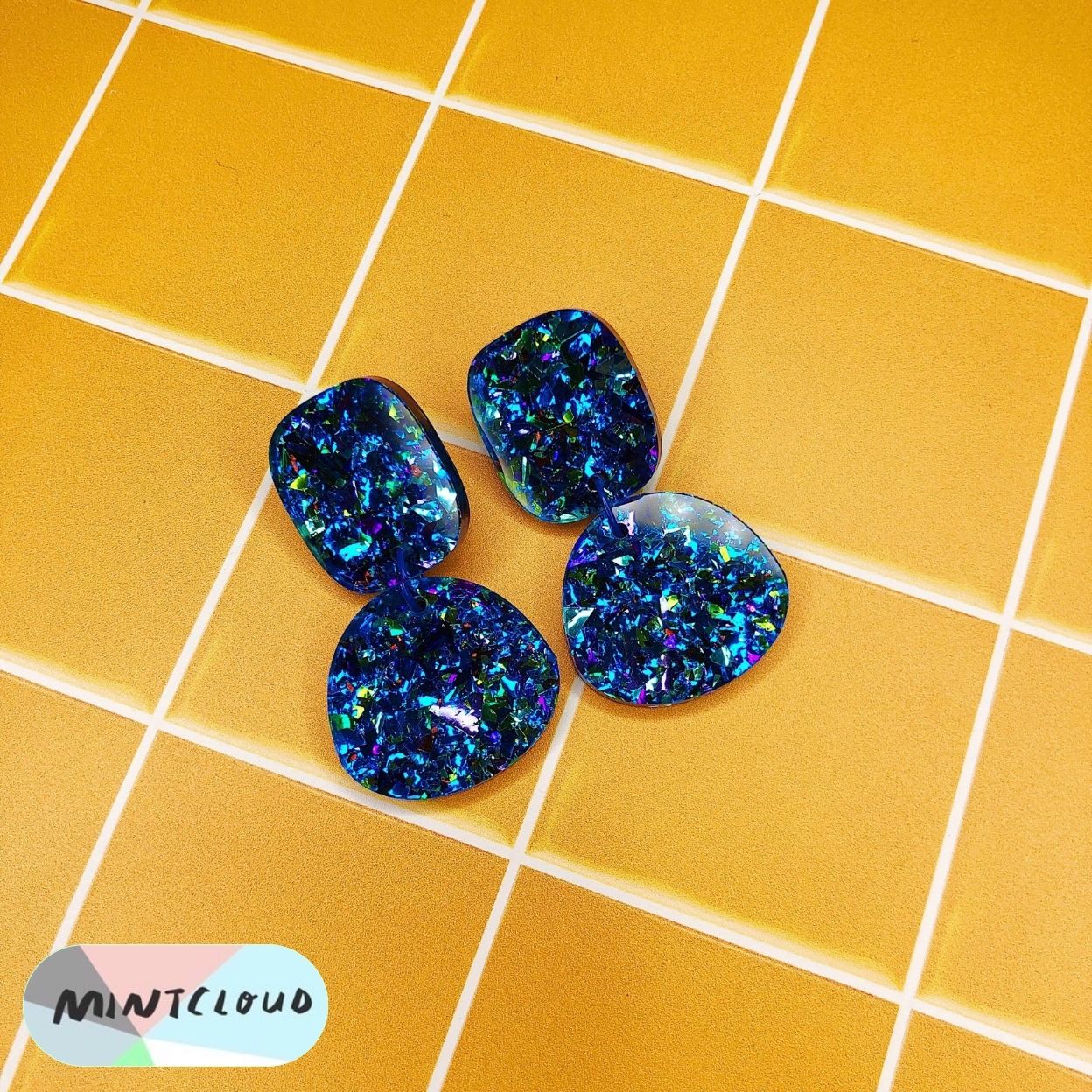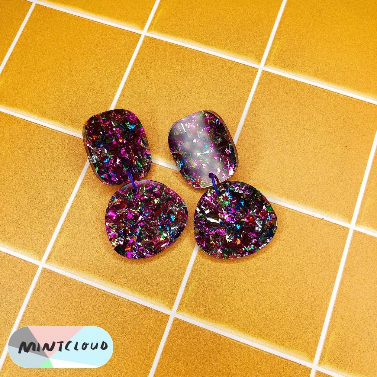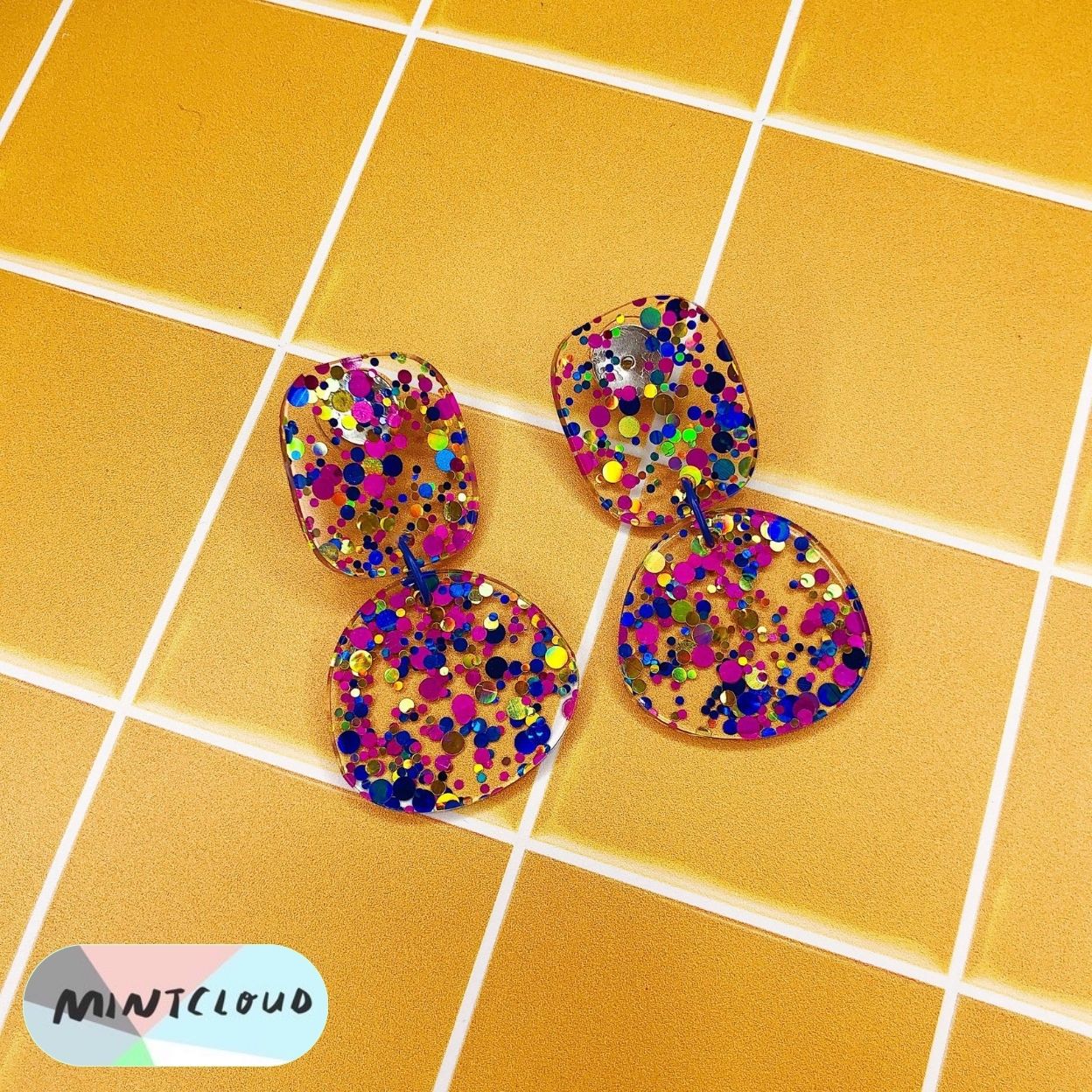 Treat your ears to some serious sparkle with these Rock Drops dangles! Adorned with glitter flakes embedded in big, bold acrylic, these earrings are sure to turn heads. Make a statement with a variety of color options available!