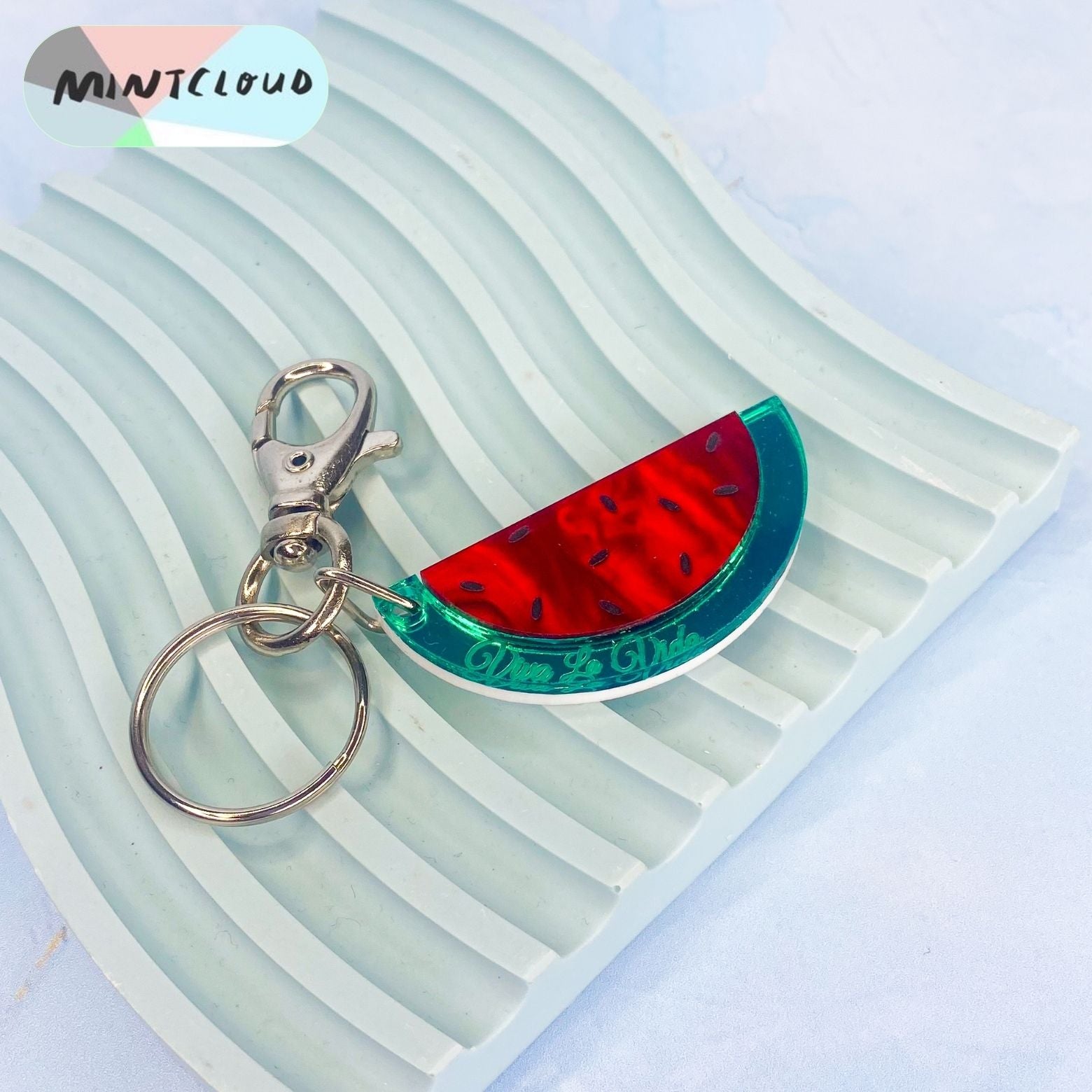 Reminiscent of Frida Kahlo's final painting, this watermelon brooch is engraved with the phrase "Viva La Vida" hidden in the rind. Show your love for Frida with this unique homage to her works, with stunning marble ripple and mirror acrylic materials that are bold and eye catching.