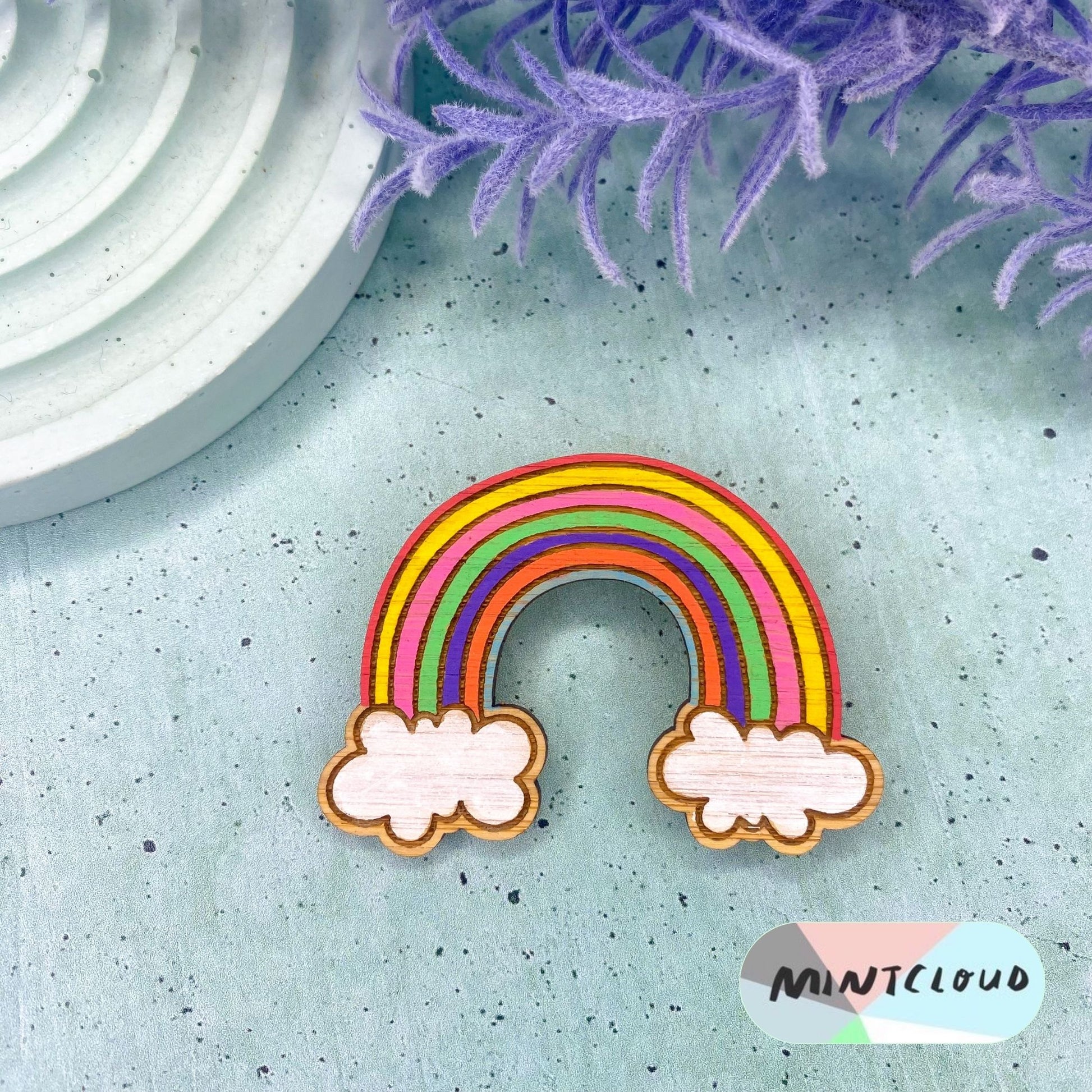 Feel the rainbow shine with this handmade bamboo brooch! Each one is beautifully crafted and hand painted with the utmost care, featuring bright and colorful details that will make any outfit pop!